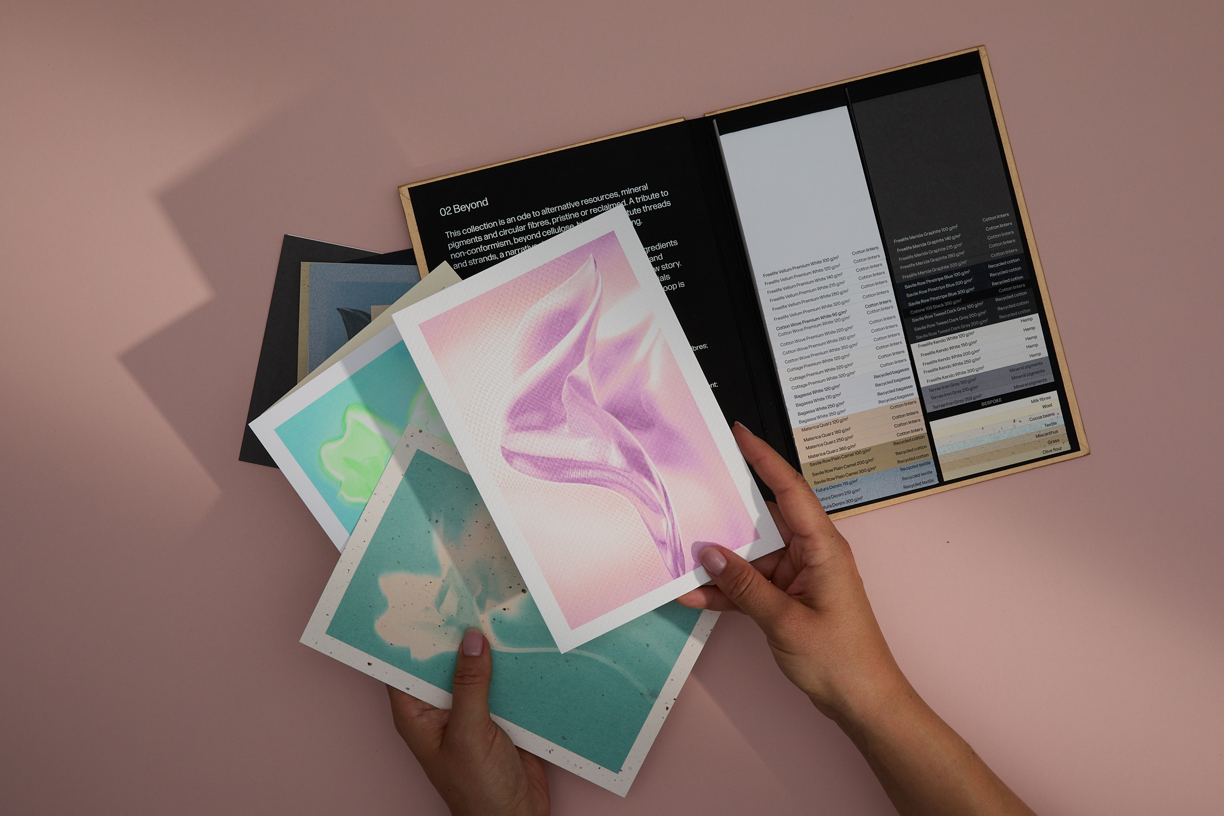 Tras Futures, que exploraba colores y acabados vinculados a las tendencias emergentes, la segunda edición —Beyond— se centra en los materiales. Esta colección presenta nuestros papeles circulares elaborados con fibras alternativas y subproductos como fibras de algodón, caña de azúcar, cáñamo, fibras textiles y pigmentos minerales. Tres perspectivas definen Beyond:
