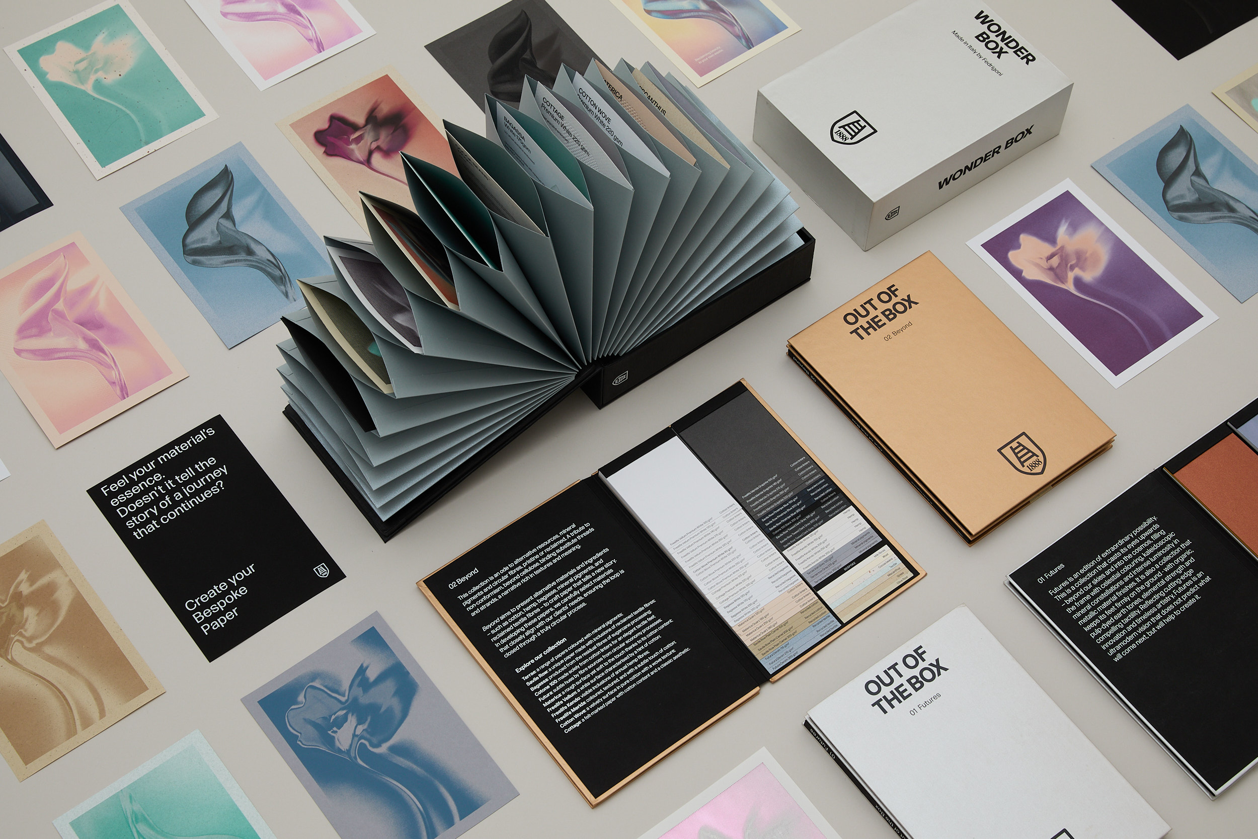 Más que una colección, Out of the Box – Beyond es una herramienta inspiradora creada para incentivar a diseñadores y marcas, al mismo tiempo que pone de relieve las capacidades de adaptación de Fedrigoni: la posibilidad de crear papeles a medida a partir de los propios materiales de cada cliente, transformando las fibras en historias únicas.